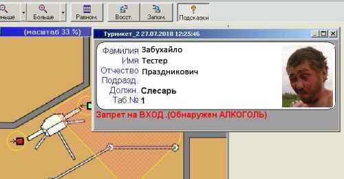 - ПРИ НЕУСПІШНІЙ ПЕРЕВІРЦІ турнікет блокується, журнал входу-виходу записується повідомлення "Виявлено алкоголь", - означає, що власник перепустки не зміг пройти через турнікет з перевіркою алкотестером. На екрані монітора охоронця виводиться вікно з даними власника пропуску та текстом "Виявлений алкоголь". В системі АСТРА-06 є можливість озвучувати події, тому можливий також висновок аналогічного голосового повідомлення;