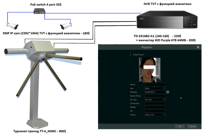 2. Відеореєстратор NVR TVT з функцією відеоаналітікі 16-х канальний мережевий відеореєстратор з підтримкою розпізнавання осіб, що працює з дозволом 8MP / 5MP / 4MP / 3MP у форматі H. 265, H. 264, запис: 8MP / 5MP/4MP/3MP/1080P/960P/720P@25 / 30fps; вхідний/вихідний потоки 160Mbps/160Mbps; аудіо: вхід: RCA x 1 вихід: RCA x 1,підтримка роботи з iOS, Andriod пристроями, База даних осіб: 16 бібліотек 10000 фото осіб, обчислення осіб: 240 фотографій / хв, пошук по зображенню особи, реєстрація особи: дозвіл:64 x 64 - 1920 x 1080, відеовихід : HDMI x 1 (4K), VGAx 1; тривожні: вхід: 8 вихід:4, перегляд архіву камер: локально/по мережі 16/16, мережа: RJ45 100 Mbps, USB 2.0 x 1,USB 3.0 x 1 , HDD: SATA x 2 до 8 ТБ, розміри 255 x 233 x 42, живлення: DC12V/4A . 3. POE Switch PoE-свіч 4х 10/100M PoE Port + 2 Uplink 100M ports RJ45 / Стандарт харчування POE: IEEE802.3af/at 30 Вт на кожен PoE порт / Загальна максимальна потужність: 60 Вт / Відстань живлення PoE: до 250м / Розміри: 142х113х40 мм, Пропускна здатність комутатора 1.6 Гбит. 4. Відеокамери з функцією відеоаналітікі 5Мп IP відеокамера; Матриця: 1/2.5" CMOS; Стиснення: H. 265/H. 264/MJPEG; Об'єктив: f=3.3-12мм (кут огляду 93.9°-34.8°); Чутливість: 0.036 Лк(колір) / 0 Люкс (Ік вкл); Запис: 5Mp 2592x1944, 4 Mp 2592x1520, 2K 2560х1440 до/з; Функції: WDR 120dB, 3D-DNR, BLC, HLC; ВІДЕО АНАЛІТИКА; Мікро SD до 128Гб; Іч підсвічування 50 метрів; Ступінь захисту: IP67; DC 12В±25%/12Вт, POE (802.3 af).Можливості системи
